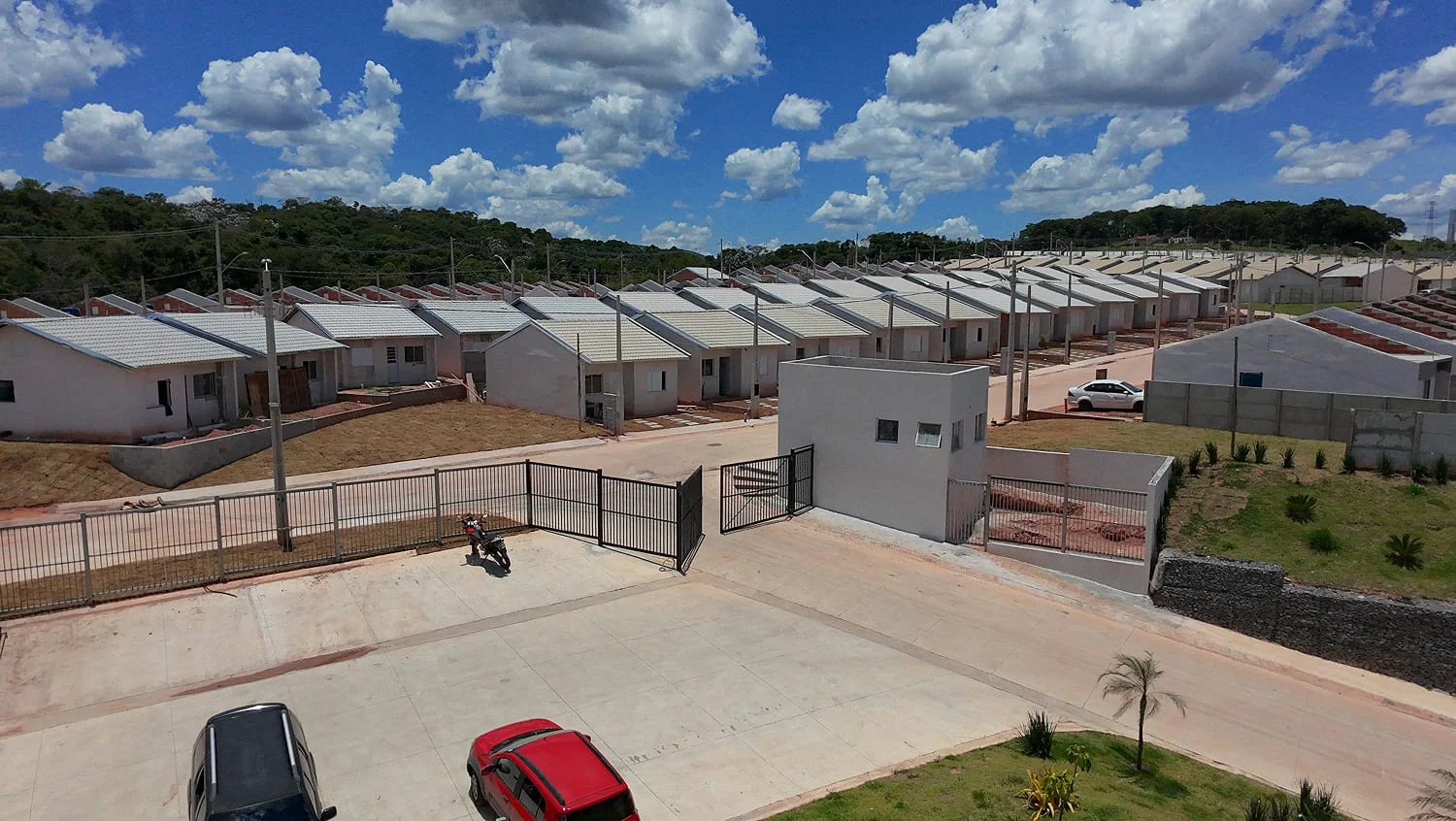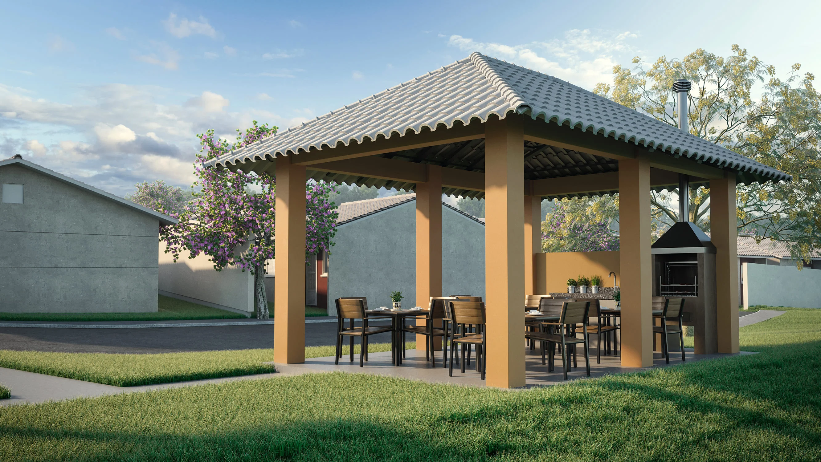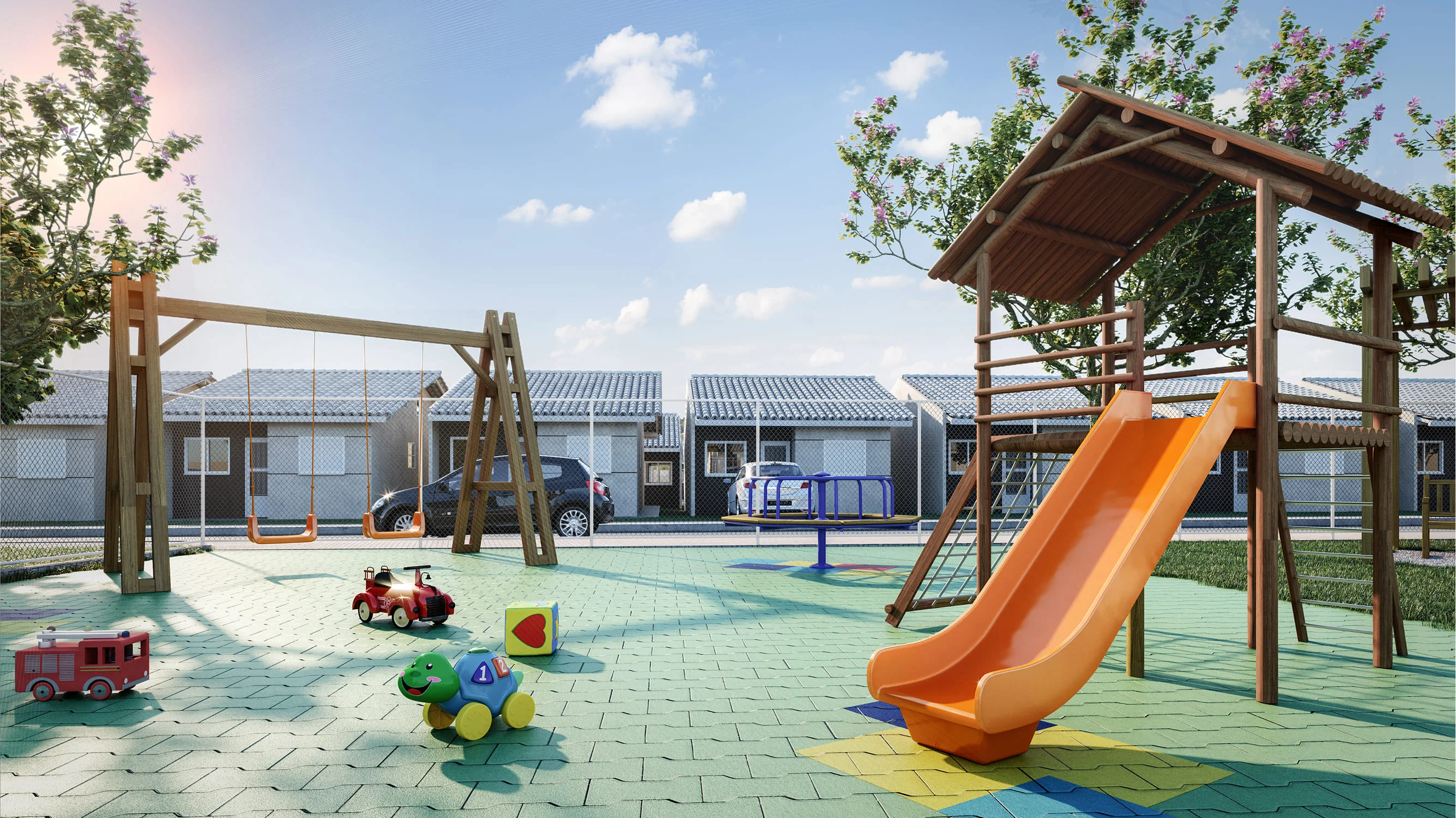 Em um condomínio fechado com portarias e áreas de lazer, você encontra casas prontas